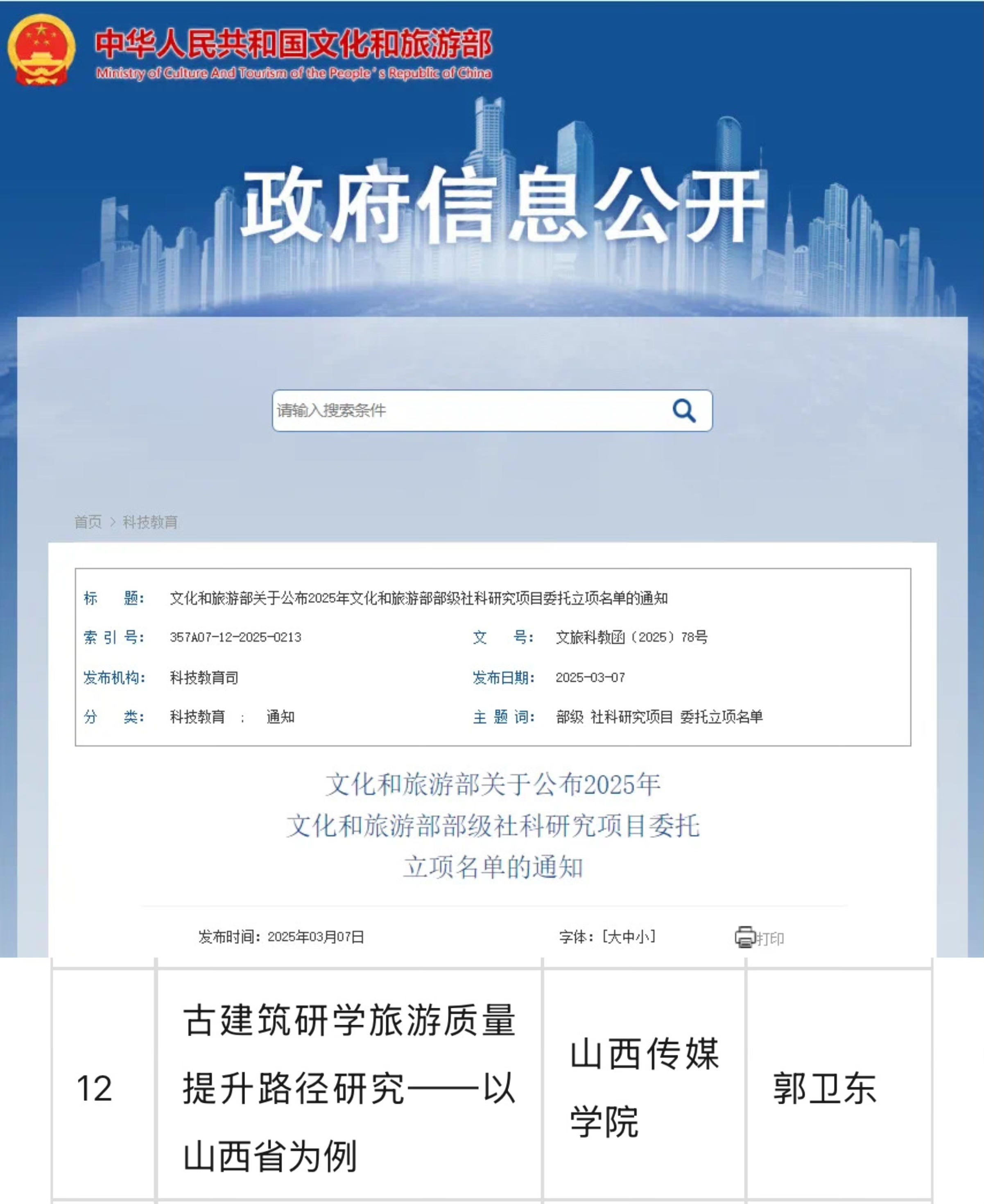 近日,经文化和旅游部公布了2025年度文化和旅游部部级社科研究项目立项名单,我校郭卫东教授申报的《古建筑研学旅游质量提升路径研究——以山西省为例》获批立项,也是本年度山西省唯一入选的研究项目。