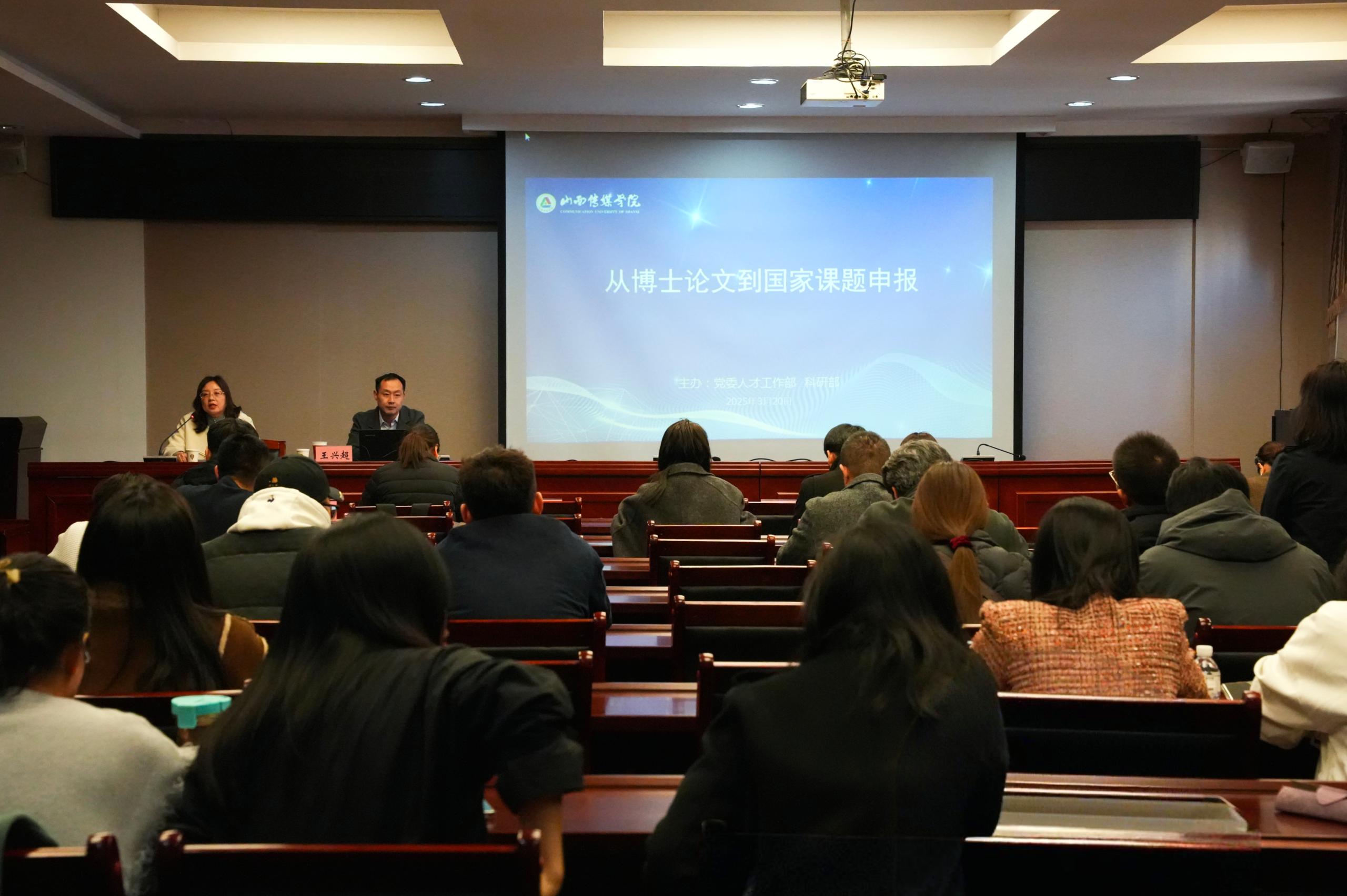 3月20日下午,由党委人才工作部、科研部联合举办的“‘大家’来讲课”第32讲在文华楼第一会议室举行。山西大学社会科学处副处长王兴超教授作题为“从博士论文到国家课题申报”的专题讲座。党委人才工作部副部长元海燕主持讲座,各二级学院(中心)科研副院长、教授、副教授及博士等100余人参加。