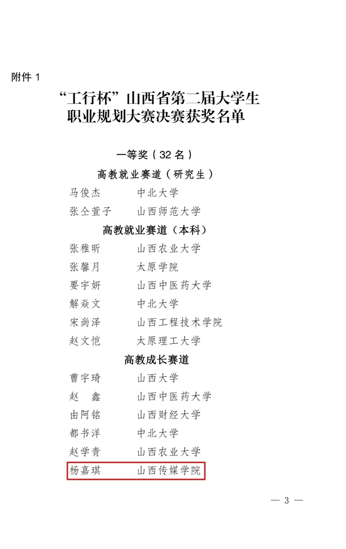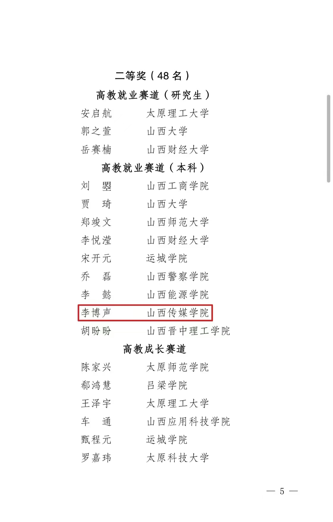 3月21日,“工行杯”山西省第二届大学生职业规划大赛闭幕式在山西工程科技职业大学举行。我校播音主持学院杨嘉琪斩获大赛“成长赛道”金奖,表演学院李博声斩获大赛“就业赛道”银奖,播音主持学院靳凤仙老师荣获“优秀指导教师”称号。本次大赛共有全省 85 所高校约 20 余万名学生报名参会,最终 158 人经校赛推荐进入省赛。共评出金奖 32 个、银奖 48个、铜奖 78 个。