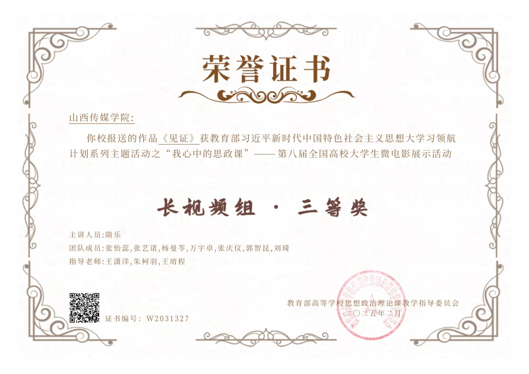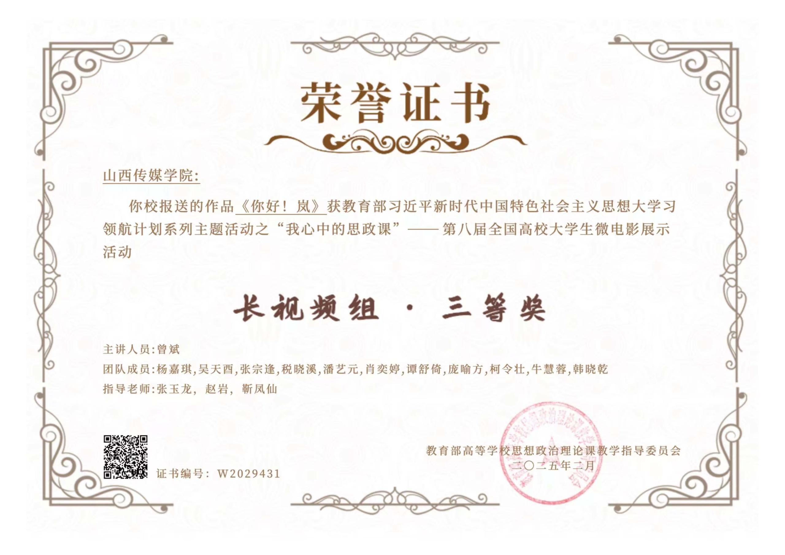 由我校王潇洋、朱柯羽、王堉程三位老师指导,隋乐等学生拍摄的作品《见证》,由张玉龙、赵岩、靳凤仙三位老师指导,曾斌等学生拍摄的作品《你好!岚》荣获全国三等奖。