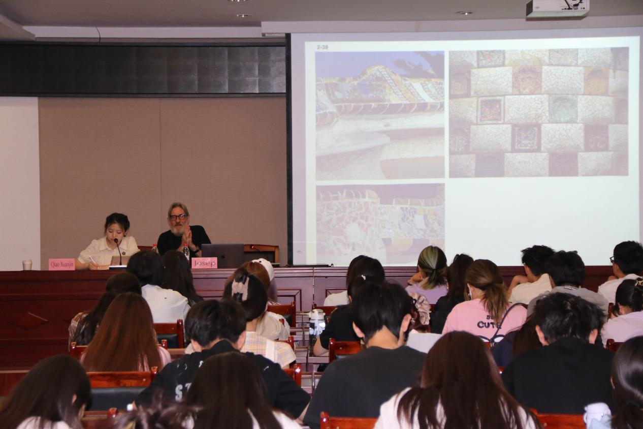 访问期间,何塞夫教授为我校相关专业70余名师生带来一场主题为《高迪之声》的讲座,分享了他在西班牙带领的学生团队如何通过声音艺术对建筑艺术大师——高迪生前工作坊进行修复的独特实践。讲座中,他借助声学技术还原高迪建筑的声学魅力,创新性地以声音诠释建筑之美,并独家分享了大量高迪生平的不公开资料,带来了跨文化交流与艺术创新的启示。
