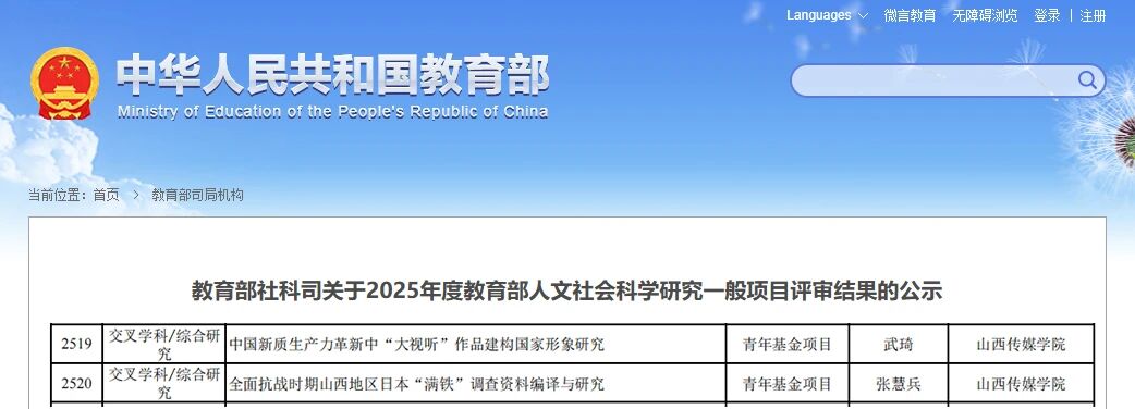 9月25日,教育部社会科学司对2025年度教育部人文社会科学研究项目拟立项名单进行公示,我校武琦、张慧兵两位教师申报的青年基金项目成功入选。我校自2023年以来连续三年每年均立项两项教育部人文社科项目,标志着我校科研正向高质量水平迈进。