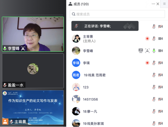 9月16日,山西大学新闻学院教授、《山西大学学报》编委李雪枫教授通过线上视频会议的形式为我校师生作了题为《作为知识生产的论文写作与发表》的讲座。此次讲座是“核心期刊编辑讲座”的第一讲,也拉开了秋季学期“‘大家’来讲课”学术活动的大幕。科研部部长王秀萍主持讲座,120名师生线上共同聆听了讲座。